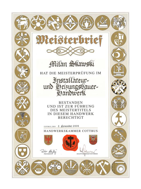 | 2001 – 2004 | Ausbildung zum Handwerksmeister in den Fachrichtungen Heizungs- und Lüftungsbauer und Gas-Wasserinstallateur an der HWK Cottbus |