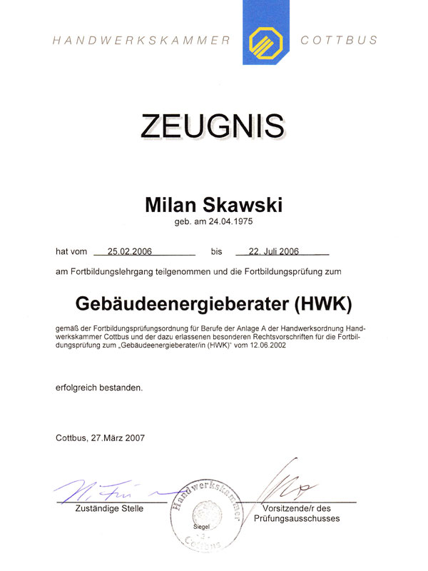| 2006 | Ausbildung zum Gebäudeenergieberater an der HWK Cottbus |