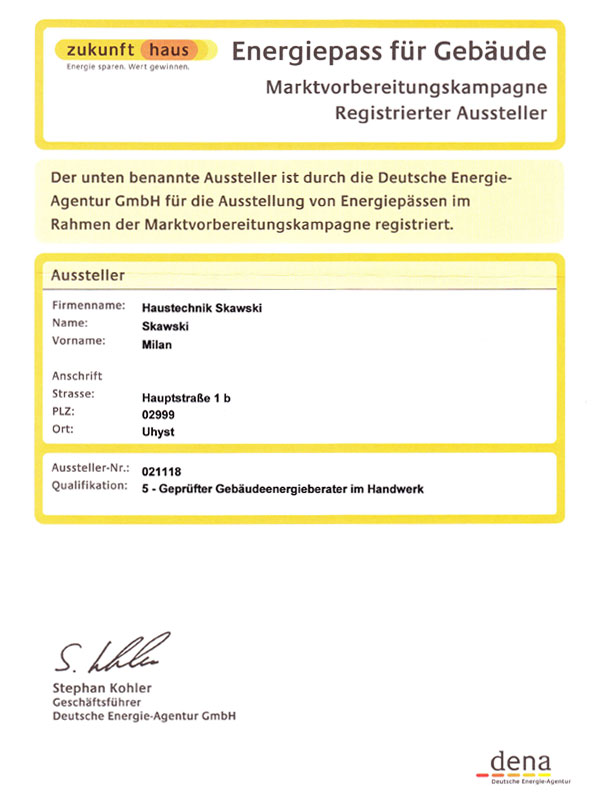 | 2006 | Eintragung bei der DENA als Bausachverständiger – Aufnahme in die Ausstellerdatenbank für Energieausweise |
