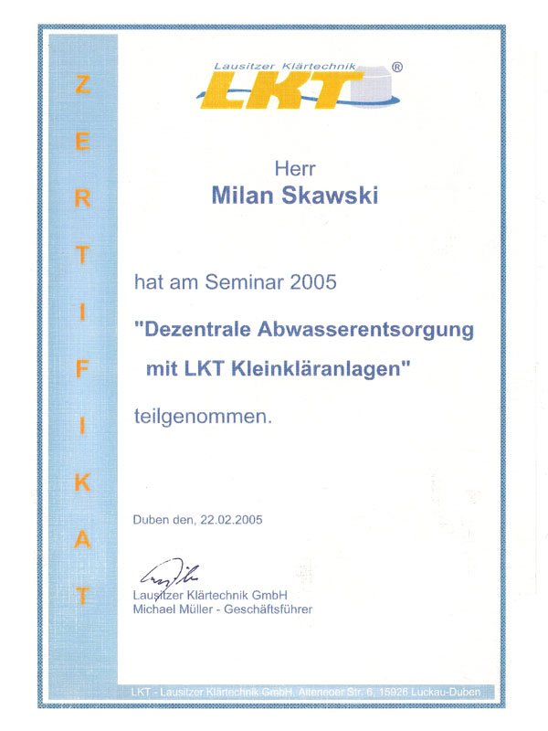 - Fachbetrieb nach § 19 WHG für Heizölanlagen Zertifikate für die Installation von Kleinkläranlagen, Wärmepumpen und Biomasseheizanlagen
