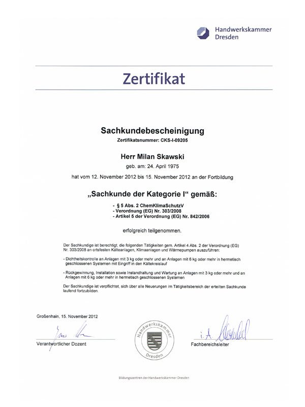 | 2012 | Klima-Schein (Sachkundebescheinigung der Handwerkskammer Dresden) |